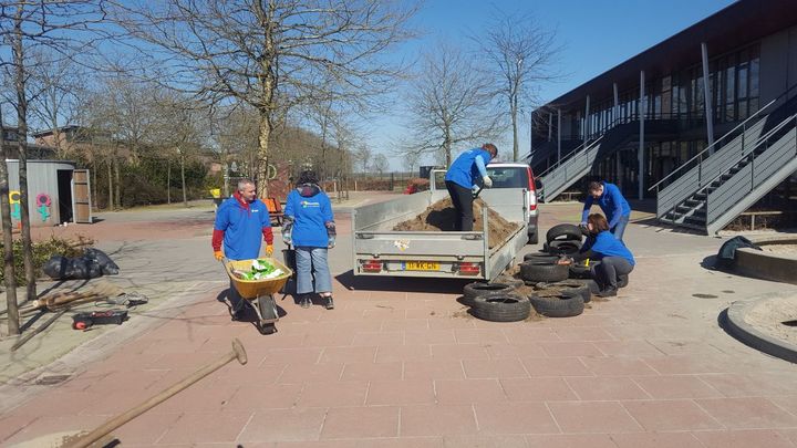 Sinds 2004 is MSD actief met het vrijwilligersproject 'Handen uit de Mouwen'. Medewerkers van MSD zetten zich dan in voor goede doelen en projecten. De hele week gaan ze aan de slag bij verschillende stichtingen, instellingen en organisaties. Gisteren werd er o.a. heel hard gewerkt om ons schoolplein op te knappen. En wat is er veel werk verzet! De pikstruiken zijn verdwenen, er is een buitenkeuken gemaakt, er liggen autobanden en tractorbanden, de buitenklas is af en er zijn voetbalgoaltjes gemaakt. Ook zij alle klimtoestellen goed schoon gemaakt. Fantastisch dus! Onze grote dank naar alle vrijwilligers van MSD en vrijwilligers die spontaan kwamen helpen! Onze leerlingen zijn er ontzettend blij mee!