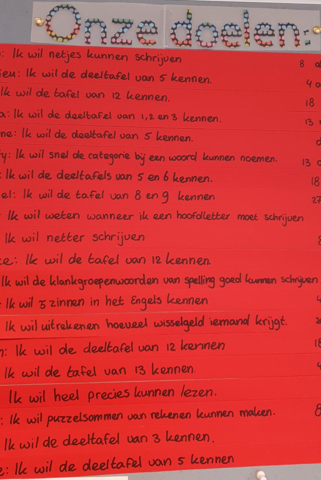 Iedere week kiezen we onze eigen leerdoelen waar we extra mee willen oefenen. We werken vaak samen aan onze doelen of zelfstandig op verschillende manieren. Soms moeten we zelfstandig werken, maar als het dan niet lukt kun je het aan je buurvrouw of buurman vragen. We doen ook vaak leerzame spelletjes zoals: concept, 30 seconds en memorie. We doen ook vaak leerzame spelletjes op de computer zoals: squla, staal, redactie sommen en begrijpend lezen.